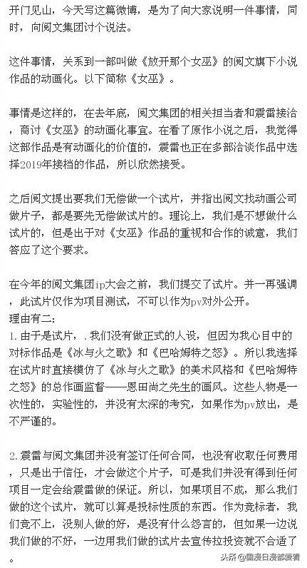 震雷这次发声,主要是声讨文阅集团将原本给其免费制作的测试动画当成动画PV,没有遵守双方的约定,在多个平台发布。而在文阅集团终止《女巫》动画化项目后,这个测试片所有权利应该属于震雷,却依然在最近被文阅集团用作其它商业宣传。