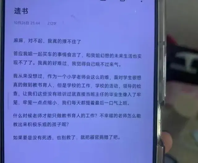 在遗书中女教师说到:“我从来没想过,作为一个小学教师会这么难,面对学生很想真的做到教书育人,但是学校的工作,学校的活动,领导的检查,让我们这些没有培训过就直接当班主任的毕业生像入了牢笼,牢笼一点点缩小,我们每天都提着最后一口气上班。”