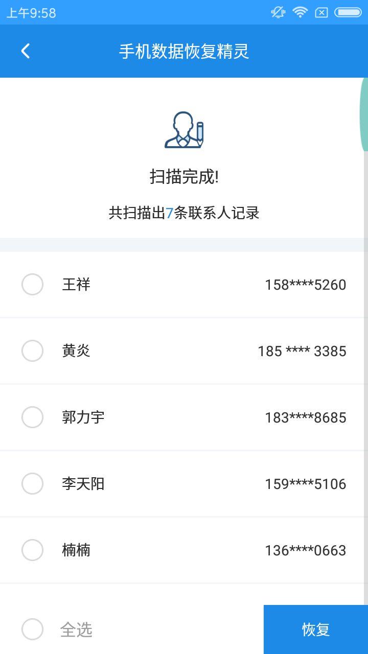 第三步:等待扫描结束之后就能看到旧手机上通讯录所有的联系人,包括之前删除过的一些联系人,之后就可以选择自己所需要的联系人最后点击右下角的【恢复】,然后就可以等待通讯录的恢复了。