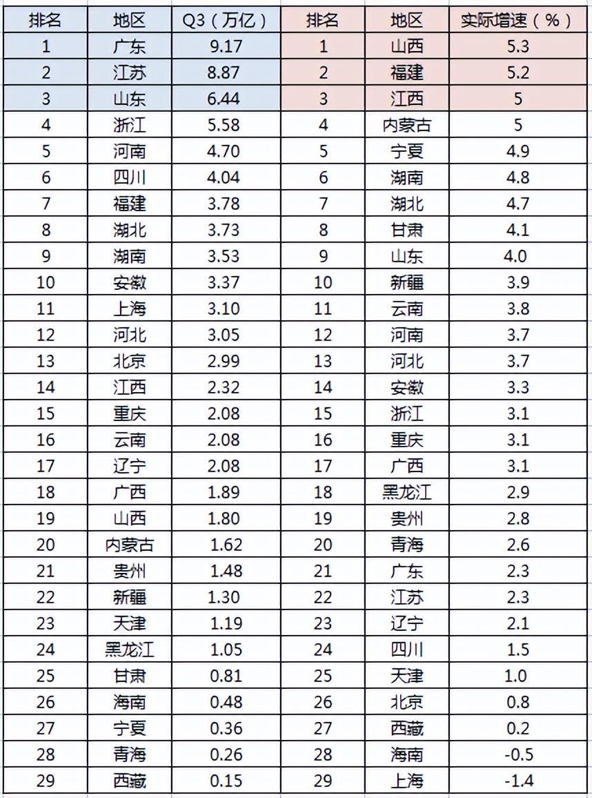 截至2022年11月1日,全国31个省、自治区和直辖市(不含港澳台地区),除陕西、吉林两省,其余29个地区均已公布前三季度国民经济运行情况。你的家乡排名第几?