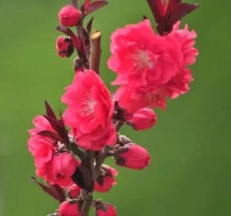 紫叶碧桃 3月上旬花芽膨大,4月初开花。花朵颜色鲜艳,初开时花色非常浓,随着时间推移花色逐渐变淡,慢慢变成绯红、粉红色、粉白色。