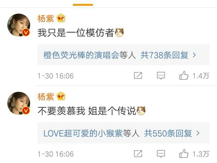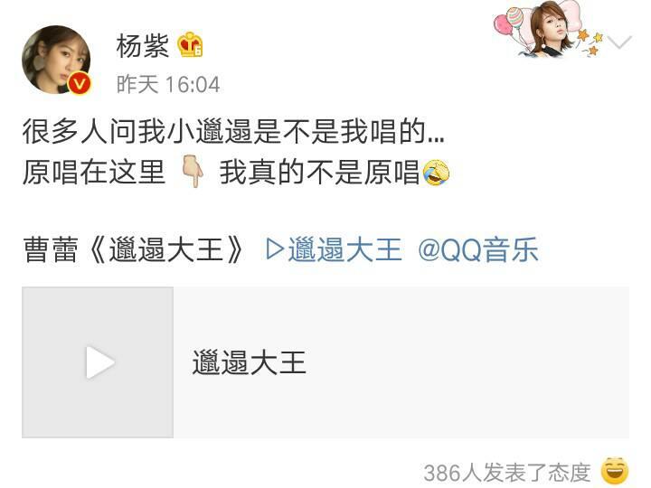 面对一堆带着认真脸的粉丝和网友,杨童鞋你的内心戏会不会是:完了,好像一不小心把梗玩大了。昨天杨紫发微博澄清自己并不是原唱,还供上了原唱链接,翻到下方,戏精紫的本性又暴露了,实在是笑哭网友。不知道以后杨童鞋对于这次的原唱乌龙会不会感到后悔,杨紫一定是被演艺事业耽误的谐星、歌手种子选手了!