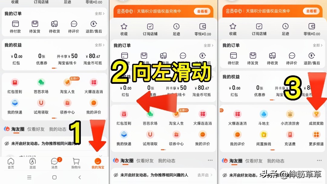我们打开淘宝,点右下角我的淘宝,用手在这个地方向左滑动一下,这个位置有一个成就奖励。