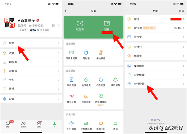 首先,我们打开【微信】->【我】->【服务】->【钱包】->【支付设置】(如下图所示)