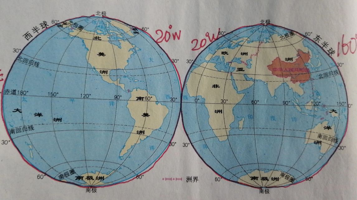 1、读世界地图,说出南北半球、东西半球的分界线,分界线两侧分别是什么半球。