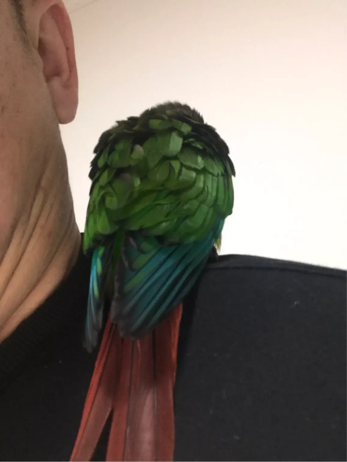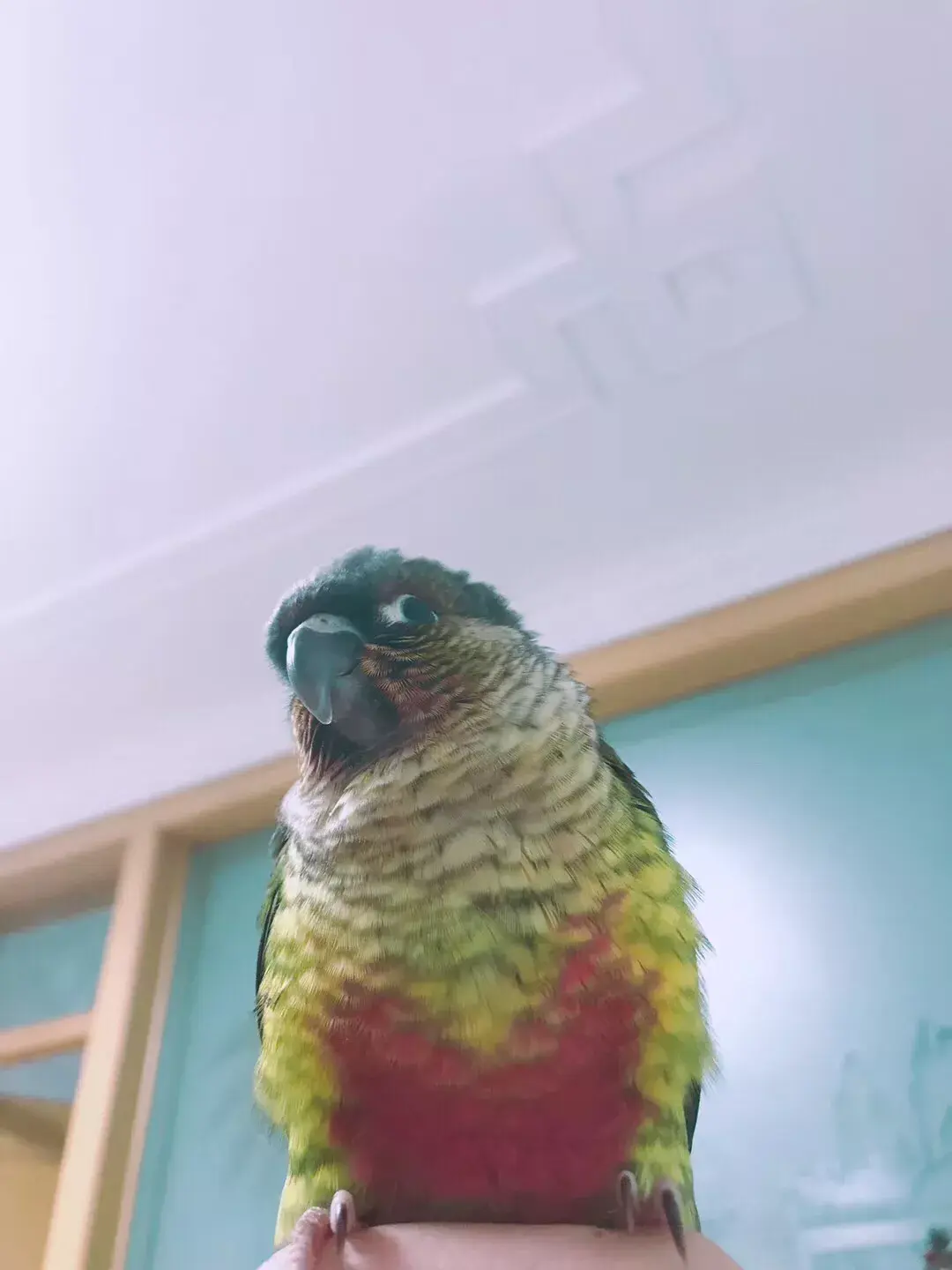 吃完食物,小鹦鹉站在手上很满足,由于手养所以小鹦鹉很粘人,喜欢要在我的手上,肩膀上,甚至头上。