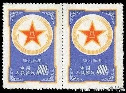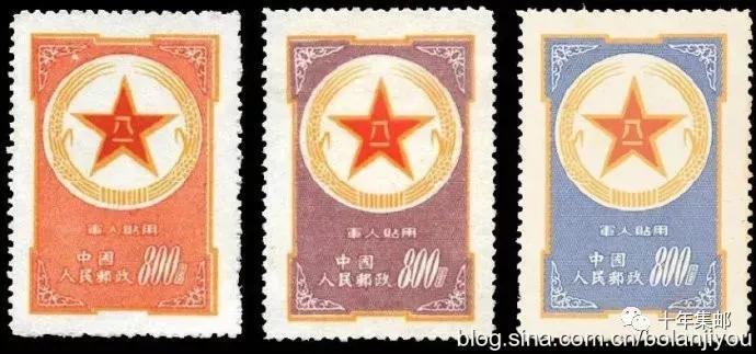 1953年2月,为了优待军人寄信,邮电部发行一套"军人贴用"邮票,邮票共3枚,面值均为旧人民币800元,第一枚底纹为橘红色,俗称"黄军邮";第二枚底纹为紫色,俗称"紫军邮";第三枚底纹为蓝色,俗称"蓝军邮"。