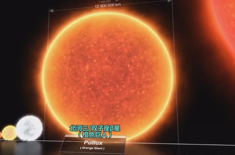 也可以说北河三是个橙色巨人,与天狼星相比,它已经大到另一个级别,天狼星的直径大约是2512560千米,而北河三的直径大概是12800000千米,也就大概是天狼星的五倍大,可想而知,我们地球在它面前连只小蚂蚁都算不上,可是我们渺小的人类却有着无限大的智慧,没准儿有一天我们真的研究出戴森球,再大的北河三也会为我们所用。