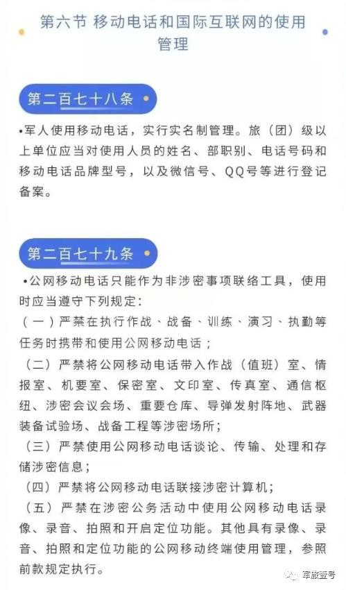 随着新条令的下发,也看得出来,手机、网络已完全融入官兵生活,但是官兵的安全意识和防泄密意识较低,成了部队的隐患。部队官兵在使用手机以及互联网时,也有相关的规定,应该注意什么呢?