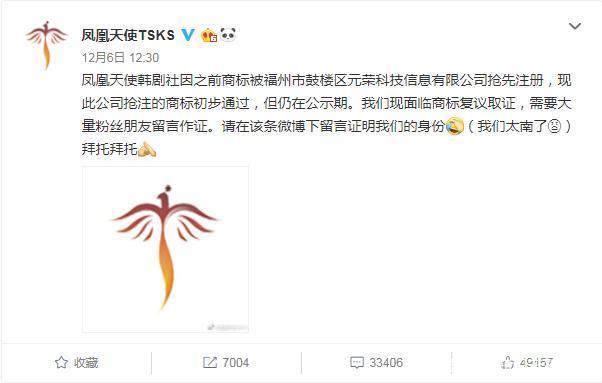文中显示凤凰天使韩剧社因商标被福州市鼓楼区元荣科技信息有限公司抢先注册,不得不面临复议取证,如今只能向粉丝求助,截止目前已经有三万多名网友参与了讨论。