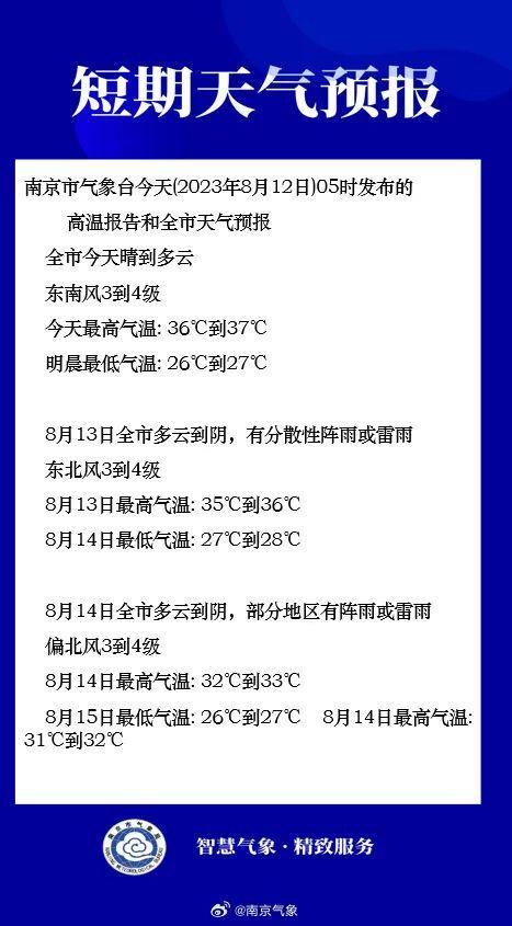 预计今天江北新区、鼓楼、玄武、秦淮、建邺、雨花台、栖霞等区的部分街道最高气温将升至37℃以上,请注意防暑降温。