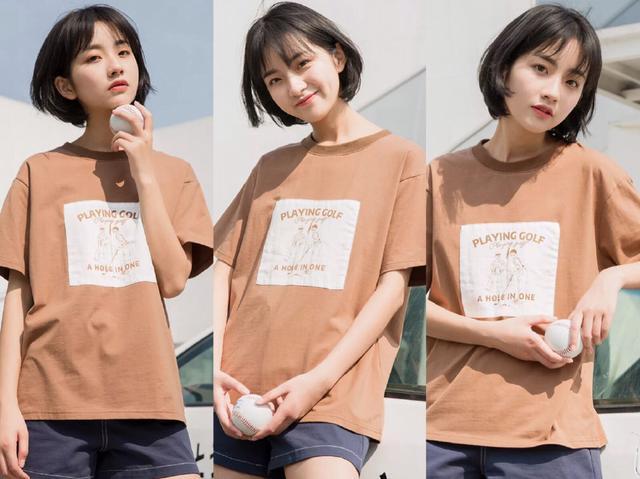 高温的天气,长头发的姑娘们已经受不了披头散发了,纷纷都想选择很清凉的短发发型,这款有点蓬松感的短发还是很受欢迎的,很自然的发色,不会很浮夸,不规则的刘海很随性,把刘海拨到额头两边也很美,刚好到肩膀以上的位置,很清爽舒适,还可以遮掩脸部,很显脸小,这样的发型很显年轻又可爱,搭配印花的t恤和短裤很学院风,充满青春的气息。