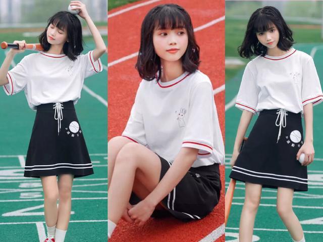 很学院风的娃娃头,很自然的发色,前面的齐刘海非常养眼,修饰脸部,很显脸小,两边的微卷效果,带给人很清纯又凌乱美得感觉,不会过长的发型,非常凉爽,整体的感觉很可爱又俏皮,搭配白色的拼色t恤很少女感,宽松的版型,不挑身材,下半身搭配一条黑色的半身裙很显瘦,可调整的腰间系带很随性,这样搭配很美又显年轻。