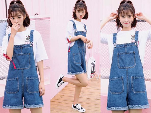搭配2:自然刘海娃娃头+牛仔背带裤+印花t恤