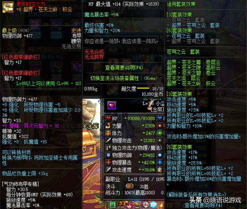 95级的布甲套苍穹之云,再未升级超界防具的时候增加了15点属强和20%的三攻,升级成为超界之后增加20点属强和25%的三攻。布甲在改版之前的确是5套防具最弱,这次如果能够按照这样来改动的话,增强的幅度还是非常大的。