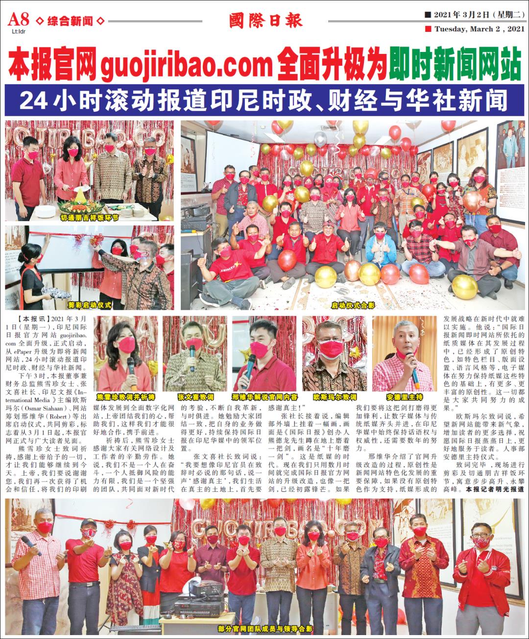 【本报讯】3月1日,印尼国际日报官方网站guojiribao.com全面升级,正式启动,从报纸ePaper升级为即时新闻网站,24小时滚动报道印尼时政、财经与华社新闻。