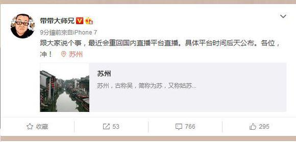 但对于其回归的平台及具体开播时间,“大师兄”目前为止还并未公布,不知是还在其他中还是故作神秘。