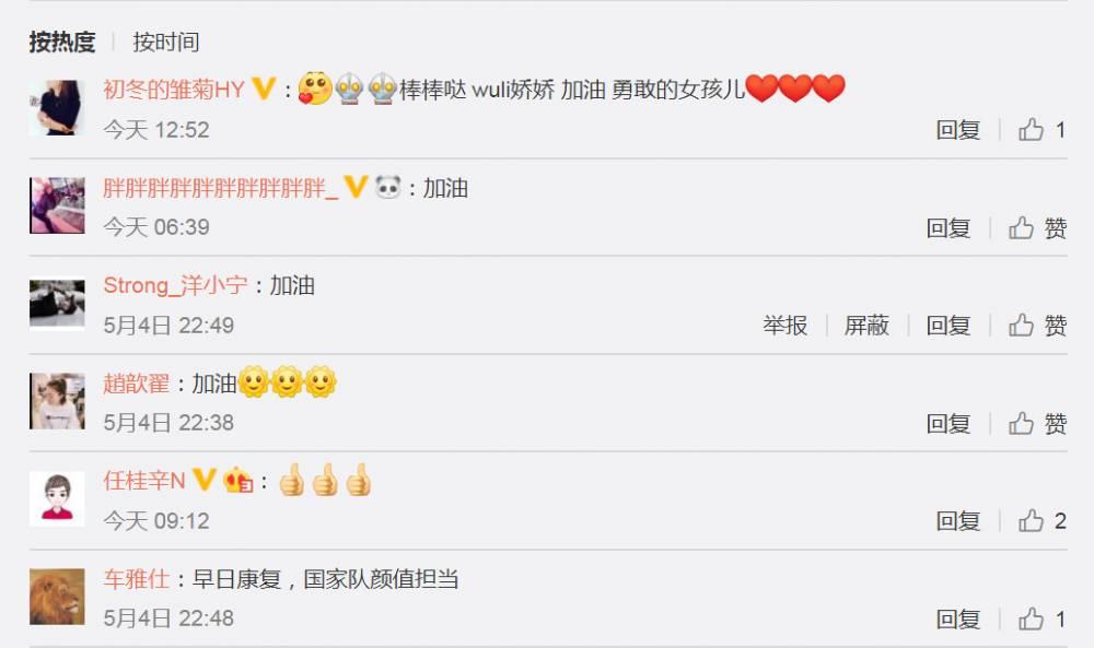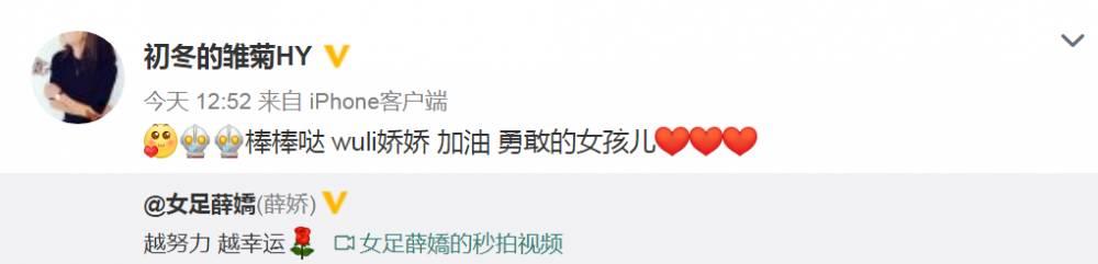 队友吴海燕转发了薛娇的视频,并鼓励道:“棒棒哒 wuli娇娇 加油 勇敢的女孩儿。”