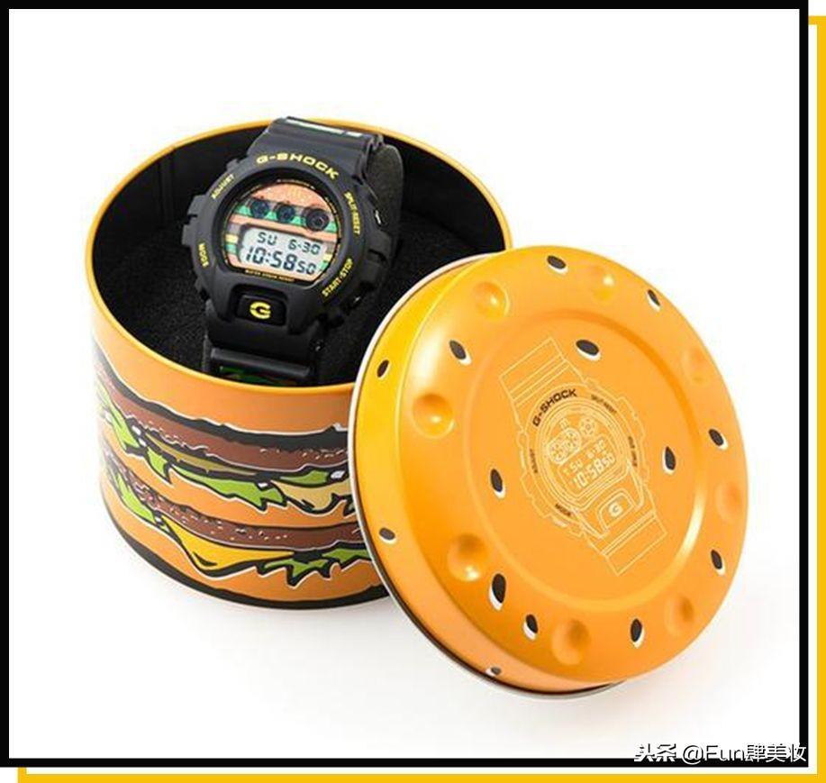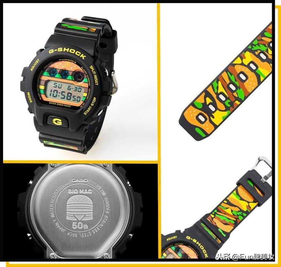 于是今年4月,G-SHOCK与麦当劳携手推出联名系列,以DW-6900为蓝本,在表盘、表背、表带等部位,加入了麦当劳巨无霸的元素。