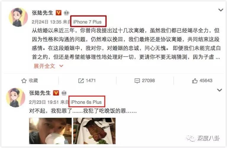 这个事情真假先不谈,张陆的手机确实是换了。2月24日中午张陆出面回应此事发微博,显示手机来源已经和2月23日晚不一样。