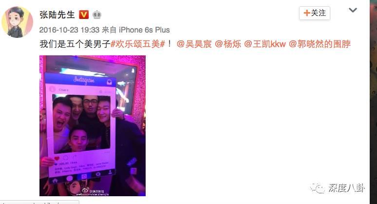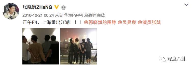 21号张陆转发微博“正午F4重出江湖”,应该是去上海准备开拍《欢乐颂2》,但没隔多久张棪琰也发微博晒出和“F4”的合照,说明他们当时是在一起的。