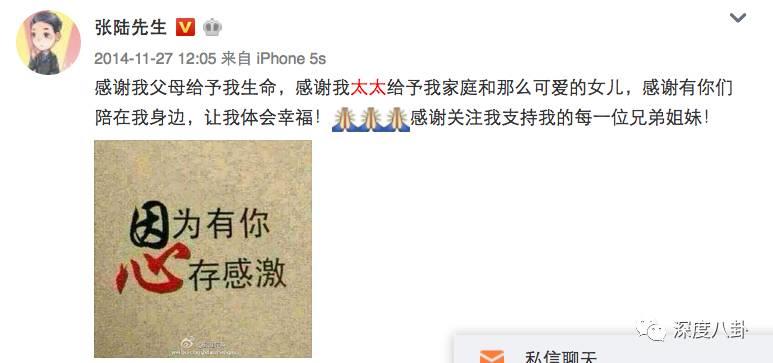 但翻了张陆的微博,发现他并没有彻底隐藏这段婚姻,在2014年和2015年时,提到过感谢太太和女儿,还直接@过邵思涵的微博。