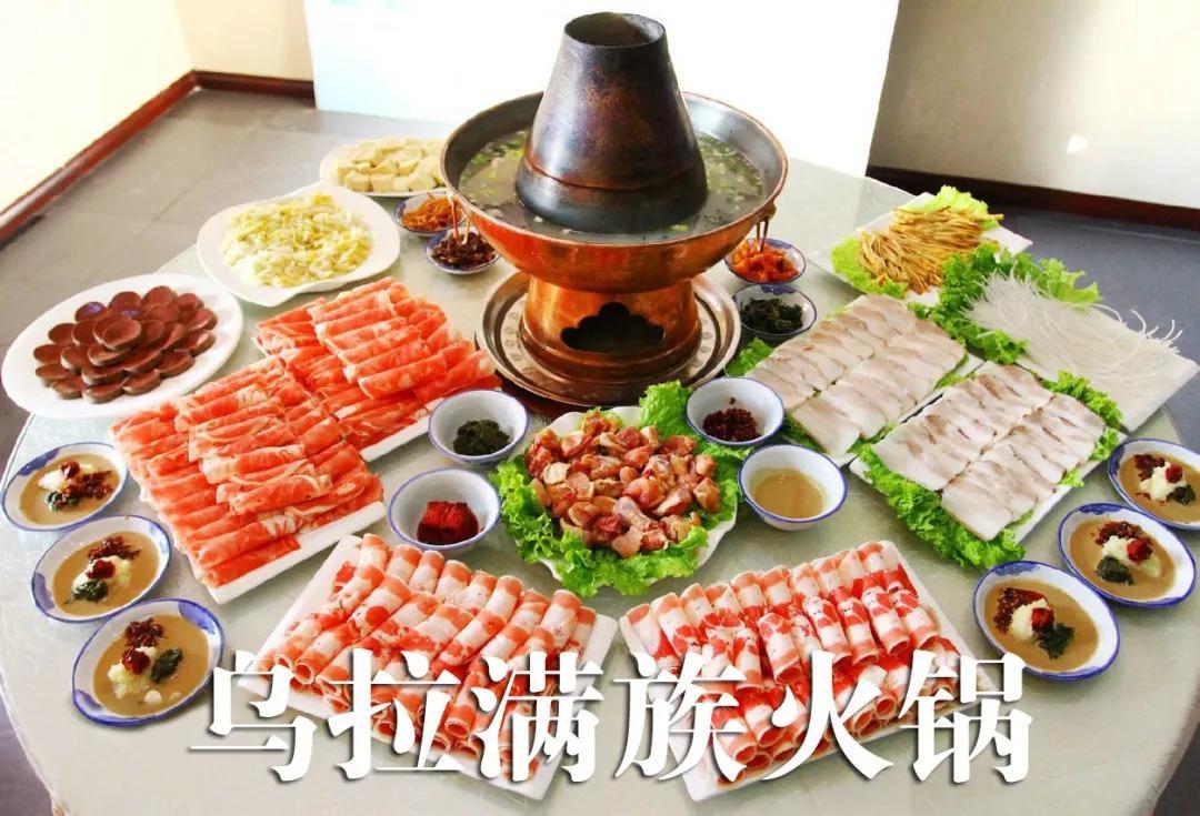 乌拉满族火锅是当地最有名的美食。它独特的烹煮方式,有“前飞后走,左鱼右虾,转圈撒葱花”的说法。“前飞”指的是飞禽,“后走”指的是走兽。乌拉满族火锅以鸡汤为底汤,鸡肉老汤结合传统中医,加入人参、天麻、枸杞、红枣、桂圆、山楂、冬虫夏草、麦冬、当归等名贵中药材,长时间精心熬制而成;肉类有鹿、狍、猪、鱼等野味,菜品有榛蘑、金针菜等山珍,配料有蛎黄、大虾等海鲜;蘸料由芝麻酱、腐乳、卤虾酱、香油、韭菜花、辣椒油等加入野山菌制成。选用食材考究,富含营养物质,通过煮、炖、焖、煨等烹制方法控制火候,吃起来肥而不腻,鲜而不懈、淡而不薄、口感适度,具有香、鲜、滑、嫩等特点。