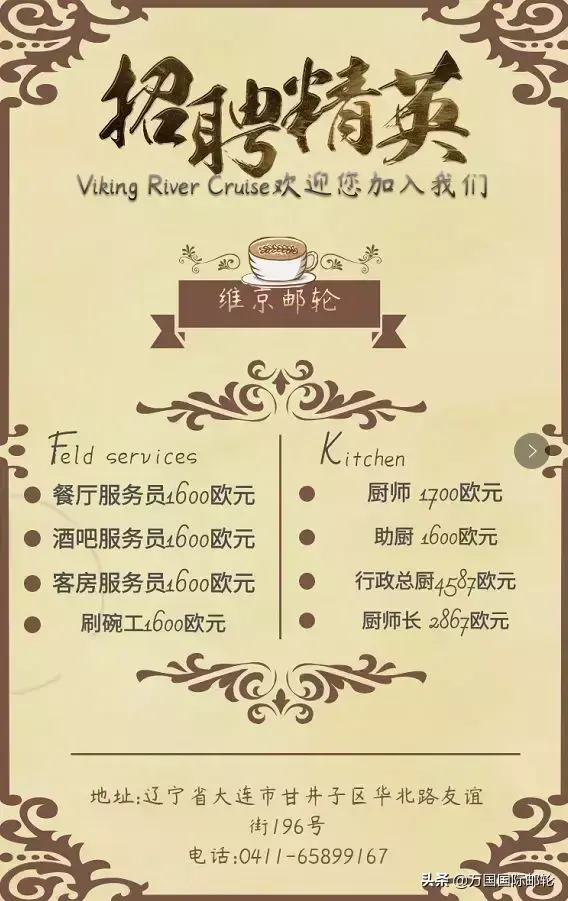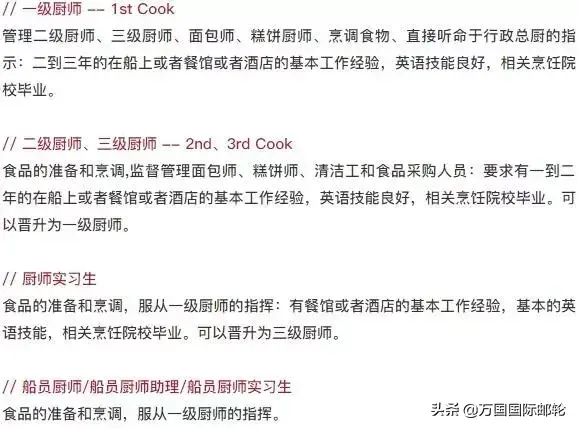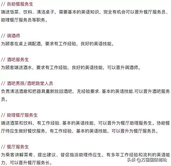 职位级别:职位要求比较高,要求英语方面的无障碍交流,在给客人提供服务的同时,也需要给负责区域的客人推介相关的消费产品,比如各式点心、咖啡、酒水以及岸上观光服务,基本薪水和小费都会比较高。