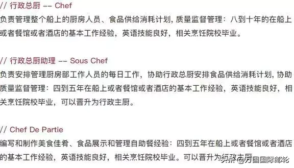 以上岗位只是邮轮上其中一部分,在这里就不一一介绍了,大家有机会到邮轮上去具体了解吧~