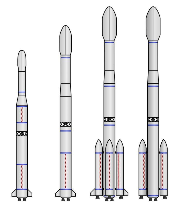 从左至右:长征三号基本型、甲型、乙型和丙型火箭对比(图改自:GW_Simulations)