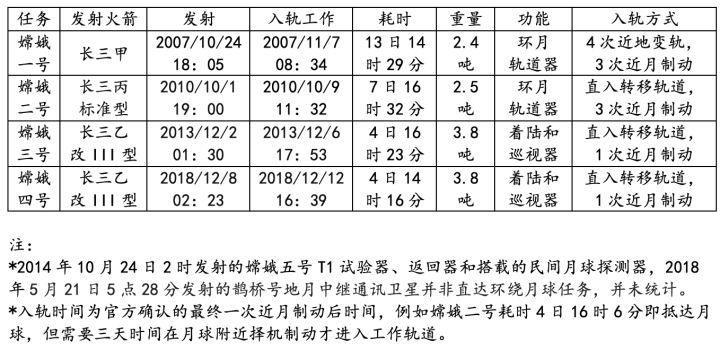 长征三号甲乙丙三个主力型号和它们的改进,托举出了中国航天高轨和深空探测的今天。以嫦娥探月工程最核心的四次任务为例,它们的情况如下表所示。