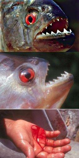 食人鲳又名水虎鱼,英文名Piranha(或) ,生活在南美洲奥里洛科河和亚马逊河流域,体长不一,可达50厘米长,鱼身粗胖,颚宽大,牙齿犹如剃刀,可相互扣紧。水虎鱼十分危险,特别是干旱季节水位下降时。平时以其他鱼类为食,饥饿时也会群起袭击进入水里的陆生动物和人,只需几分钟便可将猎物吃得只剩骨头。