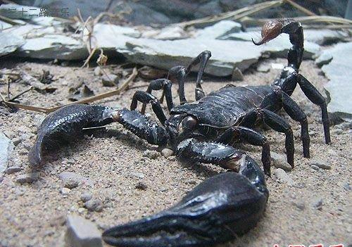 帝王蝎学名Pandinus imperator,别名真帝王蝎,非洲帝王蝎,属蛛形纲蝎子科,栖息于非洲中部及南部,刚果民主共和国,塞内加尔,苏丹,坦桑尼亚,利比里亚,几内亚,加蓬等地.为CITES II保育类.亚洲雨林蝎外表与非洲帝王蝎极为相似,但帝王蝎体型较大且粗而圆,螯呈半圆,表面十分粗糙凹凸不平,尾端的毒针则呈现红色.而亚洲雨林蝎体型消瘦,螯较狭长光滑,尾端毒针则呈现黑色或灰色.被他扎到得人5分钟内必死无疑!