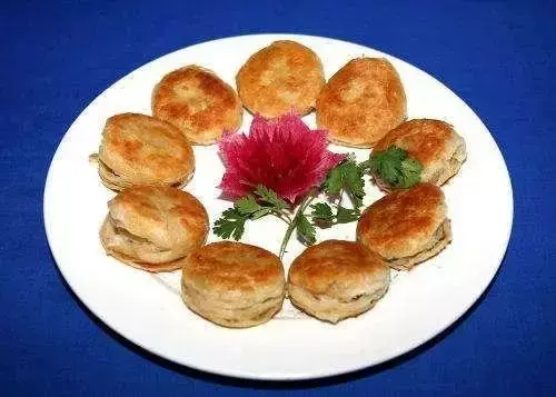 老槐树烧饼是河北邯郸汉族特色小吃。这烧饼看来与平常的相仿:圆形,表面撒满芝麻。但吃口大不相同,因饼中和入花椒盐和较多数量的香油,所以吃起来入口咸香、色泽金黄、外脆里嫩。