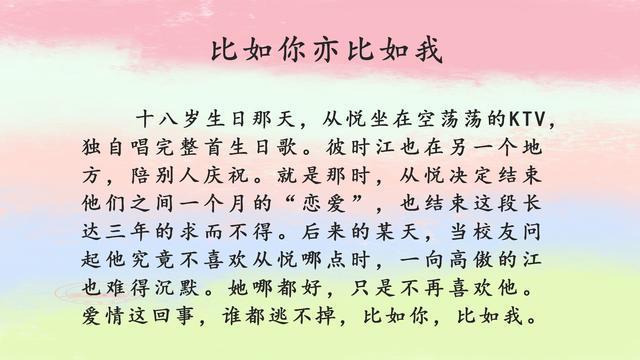 书评:女主最开始喜欢男主,喜欢了三年,大多数都是女主单方面付出,好不容易两人在一起了,男主却在女主十八岁生日的时候失约了。女主再也不做任何期望,没有一点拖泥带水的果断分手,开始学会好好爱自己。