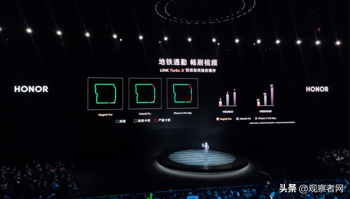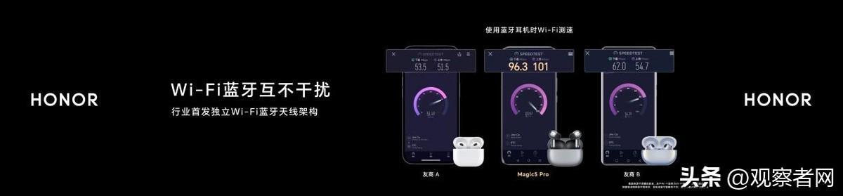此外,荣耀Magic5 Pro和至臻版还首发了独立的蓝牙天线架构,能解决目前手机使用过程中经常遇到的Wi-Fi和蓝牙信号干扰问题,实现无卡顿的蓝牙音乐、游戏体验,比如,当Wi-Fi2.4GHz和蓝牙共存的极限场景下,荣耀的Wi-Fi时延最大降低90%、Wi-Fi速度最大提升200%。荣耀Magic5系列搭载自研LINK TurboX技术,能够基于地理围栏和网络变化智能识别网络不佳区域,提前预加载,娱乐不中断。