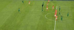 案例:如下面绿色球衣队员,传球时两名进攻球员前面除了守门员没有任何防守球员,传球瞬间接球人在球后面,进球有效。