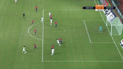 案例:中超的一场比赛,重庆当代对阵武汉卓尔。卓尔球员将球吊入禁区,队友头球摆渡,皮球碰到防守队员后,又弹到了处在越位位置的卓尔队友身前并推射破网,但因越位进球无效。