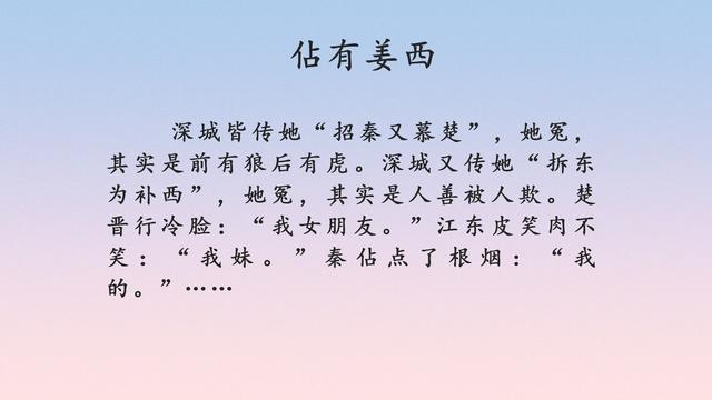 男主秦佔,女主闵姜西,一场情深似海的爱恋。