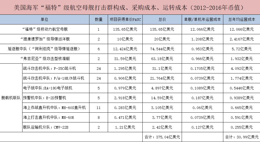就以美国“福特”号航空母舰打击群为例,纯硬件采购成本为375亿美元,每年的维护费用(包含人员、弹药、燃料)31亿美元。所以,航空母舰真的很烧钱……