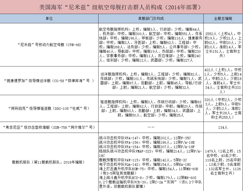 至于人员编制方面,“福特”级航空母舰人员编制暂时不清楚,但是2014年部署的“尼米兹”号定员2552人、“提康德罗加”级导弹巡洋舰编制422人、“阿利伯克”级驱逐舰编制320人、“弗吉尼亚”级攻击型核潜艇134人、舰载机联队编制1479人、打击群司令部70人。也就是说,整个战斗群人员总编制在7200人左右。