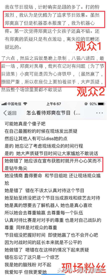 也有粉丝为郑爽说明:这才是真正看重队员的表现,因为不想看到任何一个队员心爱的机甲报废,她才会这么激动的。而且这次她是为了团队,才公然针对整个裁判组,足以证明她在为了自己的队员争取应有的权利!
