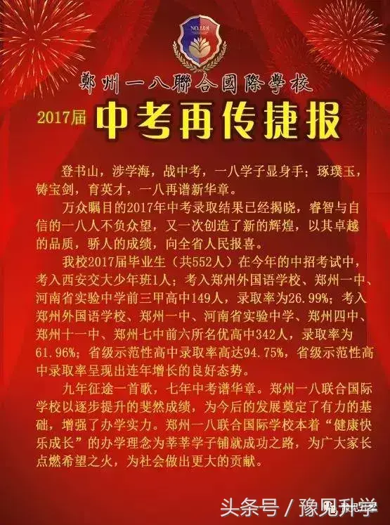 2017年中招毕业生552人,理化生实验操作考试,满分509人,平均分29.85分;中招体育考试,满分175人,63分以上507人,平均分67.54分;中招综合成绩裸分最高672分,600分以上405人,全年级平均611.8分。其中149人被郑州一中,省实验,外国语三所学校录取,342人被一中,省实验,外国语,十一中,四中,七中录取。省示范性高中录取率94.75%。