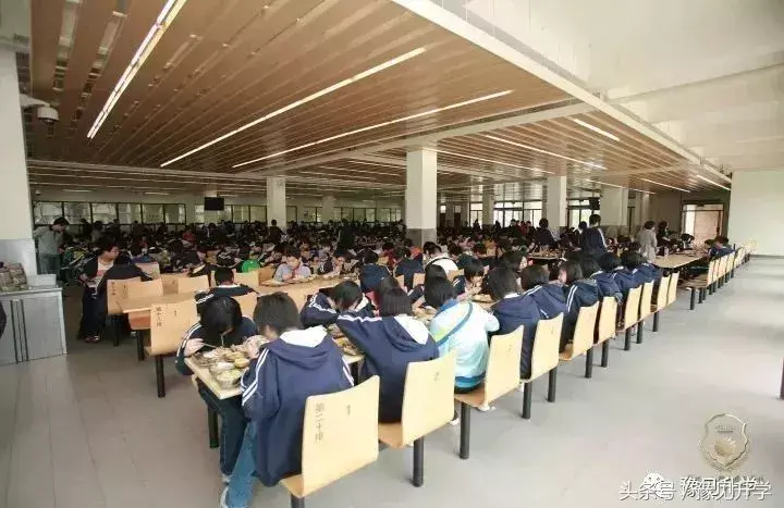 学校食堂从外观看起来很干净卫生、桌椅摆放整齐。整个食堂有2000多平米,学校的饭菜是营养师制定的统一配餐,三菜一汤外加米饭、水果、点心,等花样变化较多。