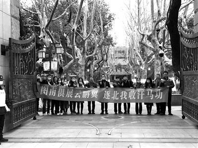 杭州高级中学校长蔡小雄和老师们拉开横幅为同学们加油。 张娜 摄