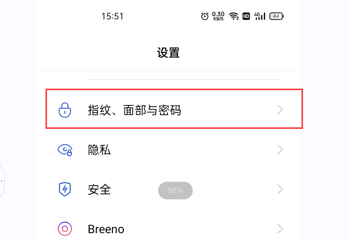 2、找到“指纹、面部与密码”选项,点击进入,有的手机是在安全功能选项里面;