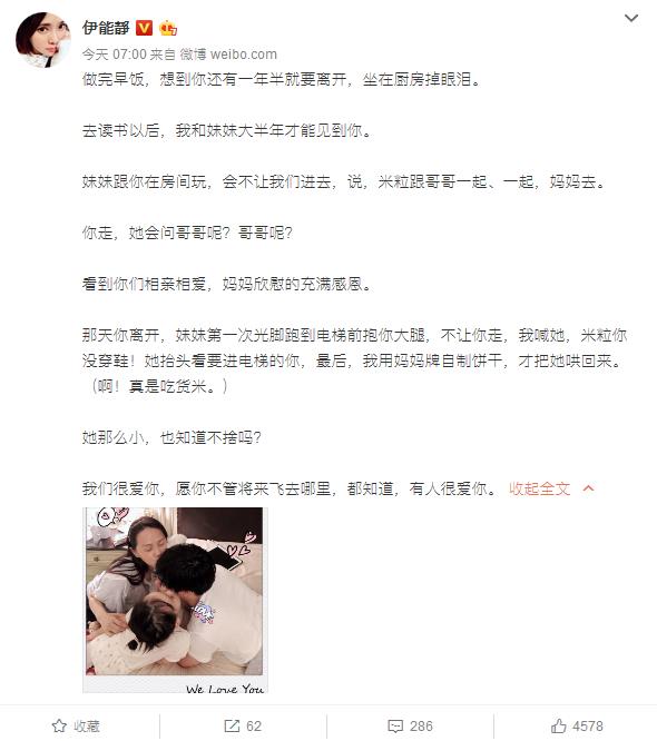 伊能静发微博长文,讲述儿子将要外出求学半年,自己与女儿米粒的不舍。她写道:“做完早饭,想到你还有一年半就要离开,坐在厨房掉眼泪。去读书以后,我和妹妹大半年才能见到你。”“妹妹跟你在房间玩,会不让我们进去,说,米粒跟哥哥一起、一起,妈妈去。”“你走,她会问哥哥呢?哥哥呢?看到你们相亲相爱,妈妈欣慰的充满感恩。”