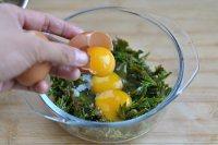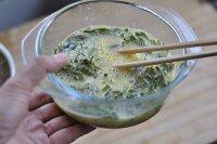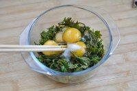 2.把洗净的花椒芽盛到干净的小盆里,磕入鸡蛋。