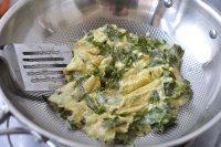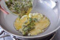 5.锅里倒入少许植物油,油热后倒入花椒芽鸡蛋液。
