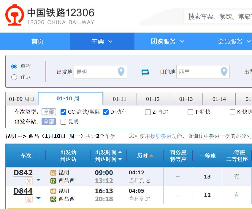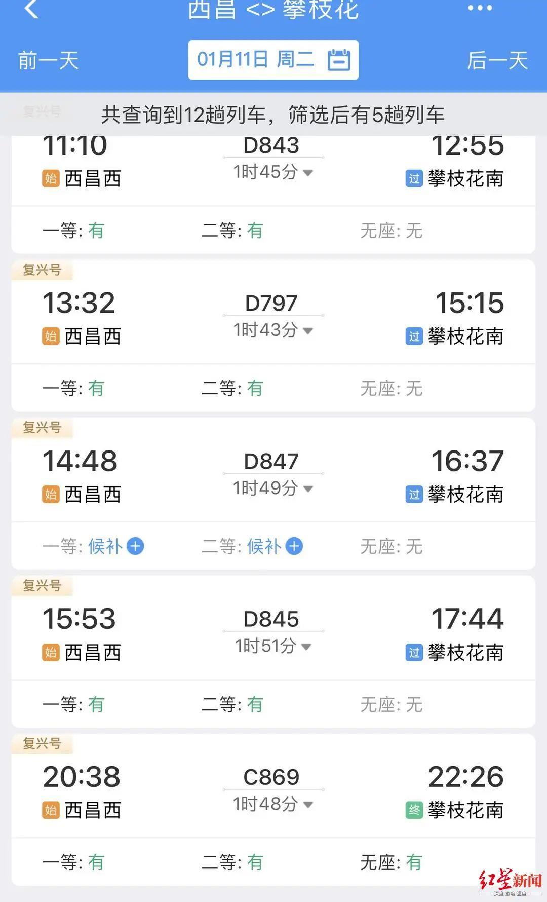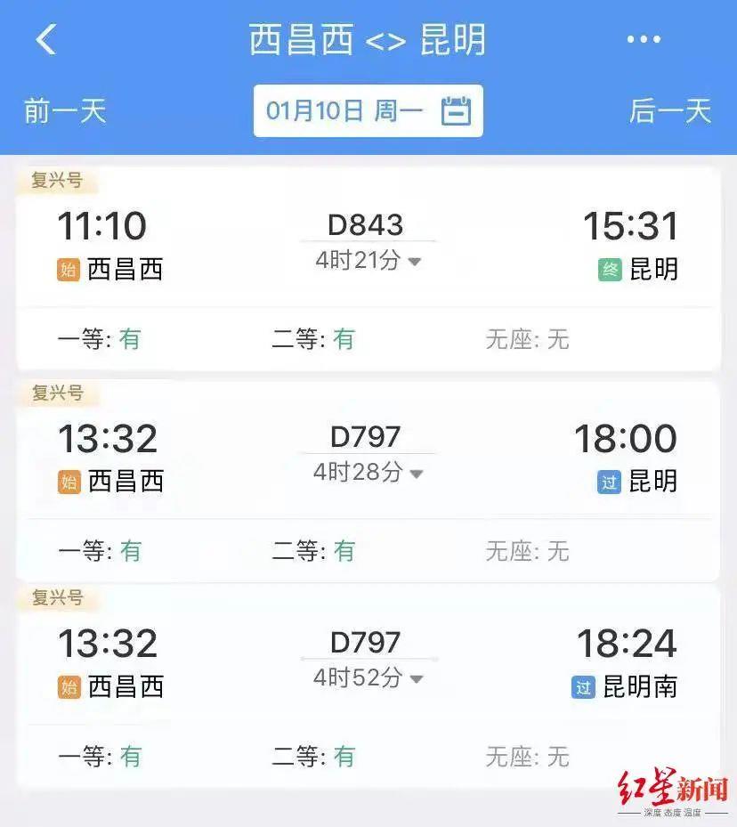 1月9日上午,记者在12306官网查询发现,凉山州首发动车为西昌西至昆明D843次,列车于1月10日上午11点10分从西昌西站开出,途经德昌西、米易东、攀枝花南、永仁、元谋西,于15点31分到达终点昆明站,全程4小时21分,二等座115元,一等座184元。